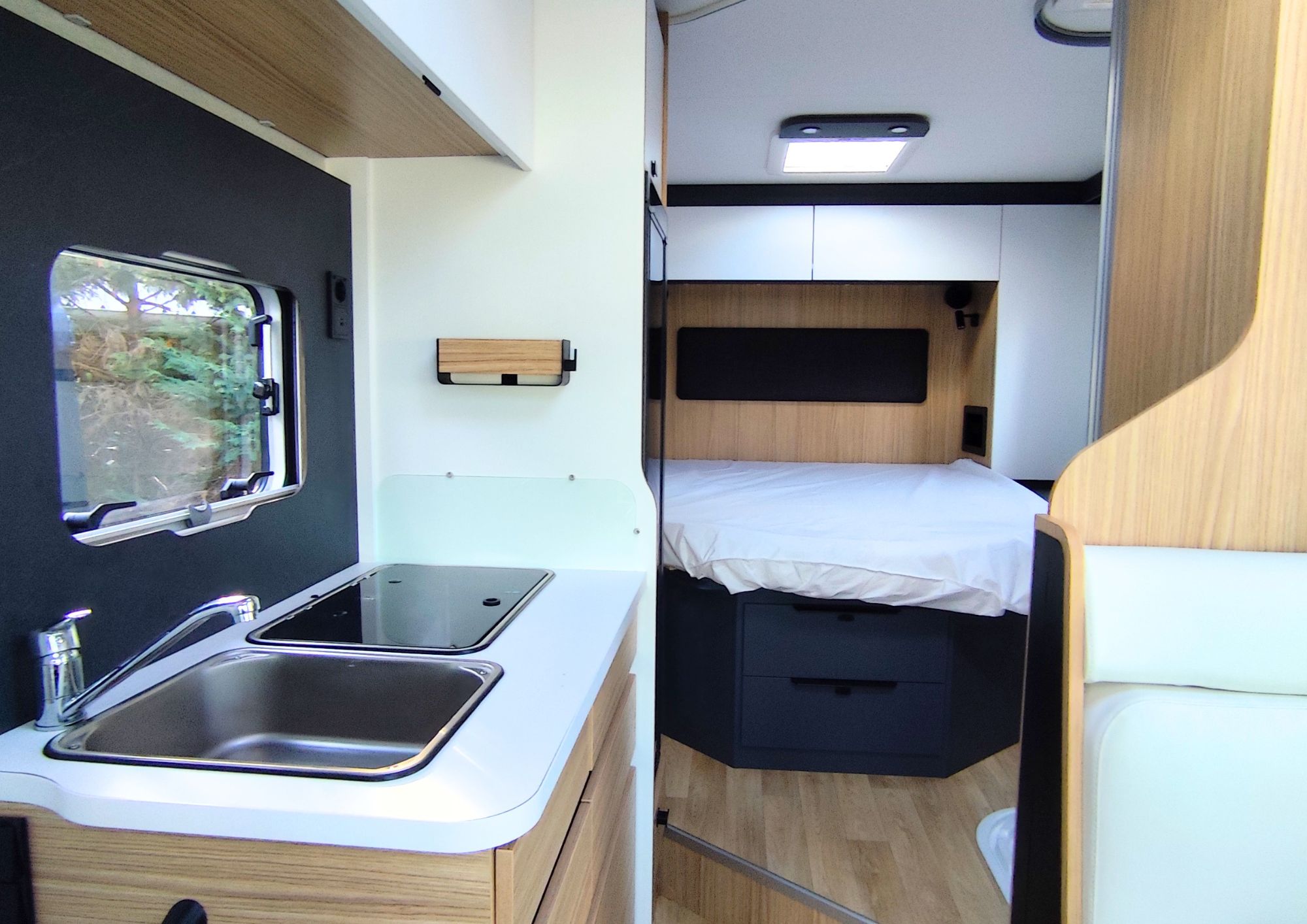 À l’intérieur, profitez d’un aménagement intelligent avec un salon convivial modulable, un couchage confortable et de nombreux équipements pensés pour votre autonomie : panneau solaire, batterie cellule AGM, chauffage Truma performant et équipements pratiques du quotidien.